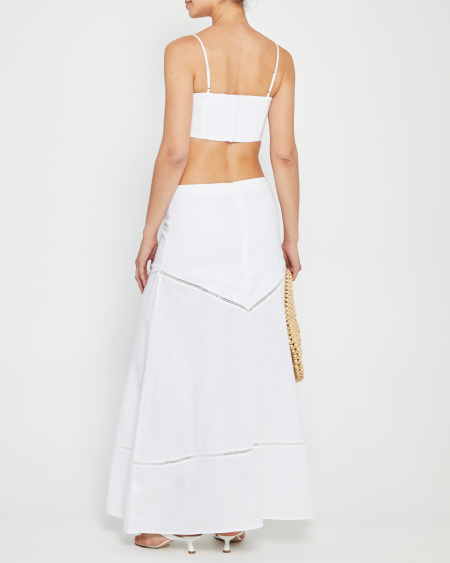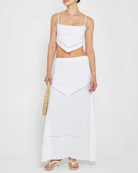 $267.00Product Details This crisp white set is equal parts comfy and stunning with its elastic, strappy details. Done with a cropped top and high waisted skirt. – Elastic straps– Front slit– Content: 40%Linen, 55%Viscose, 5%Polyester Style# C23WST33003 Fit Notes – Model wearing a size XS – Model measurements: 5’9.5” Height /…